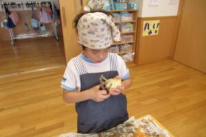 ピーラーと包丁を使って、慎重に野菜を切った年長さん。「にんじんかたい!」「じゃがいものかわむき、むずかしいよ。」なんてことも言いながら、自分たちの力でやり遂げました!