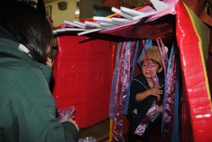 年少組さんはうさぎの滑り台や、きりんの玉入れをつくって