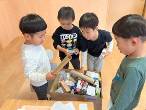 「これを使おいかな~?」と自分たちで好きな廃材を選んでいるよ。