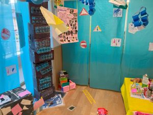 たくさんの大きな作品を作ってきた造形展が終わった後も子ども達は作品に触れ、楽しんでいます。「宇宙人になりたい」自分で宇宙人の服を作り、宇宙人になりきって踊ったり遊んだりしています。