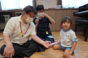 おやつの後は『あくしゅでこんにちは』の音楽で自己紹介ゲームを行いました!