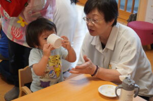 おやつを食べた後は自己紹介をして交流したり、『じゃぶじゃぶっぶー!』や『バスにのって』などのふれあい遊びを
