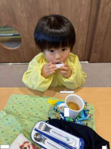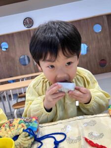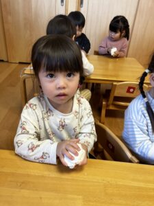 「中にご飯入ってる!」「モチモチする。」と、感想を伝え合いながら味わって食べていました。