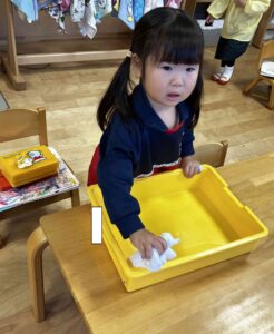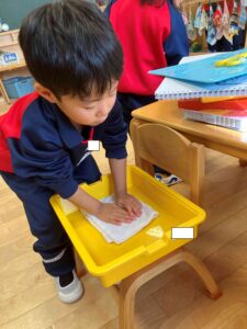 2学期も沢山遊んだ保育室をみんなでふきふき!
