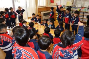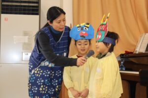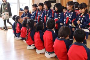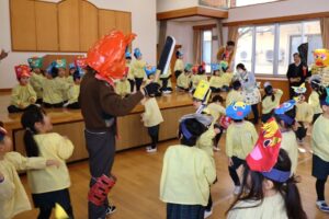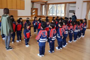幼稚園だより 2026.02.03節分(豆まき) 鬼は~外、福は~内! 大谷幼稚園で豆まきを行い、みんなの心の中に棲む悪い鬼を追い出しました。 ※伝統行事のため、炒った豆を使いましたが、事前に子どもたちと「食べたり、いたずらしたりしない」とお約束をし、安全に配慮して豆まきを行いました。 幼稚園だより 2026.02.02幼年消防引継ぎ会 火の用心!マッチ一本火事のもと! 懐かしいかけ声とともに大谷幼稚園の幼年消防団が園内を巡回しました。そのあと3月に卒園を控えた年長組さんから年中組さんへ幼年消防団のハッピとともに「火の用心」の心構えを引き継ぎました。年中組さん、これからよろしくね!