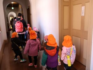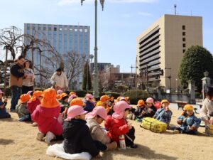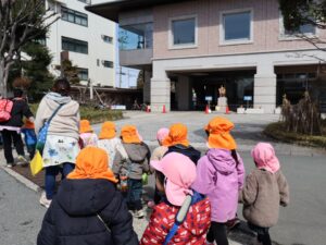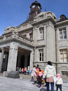 3/6(金) 春の暖かい日差しの下、年少児と2歳児のみんなで文翔館にお散歩に行ってきました。