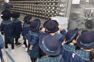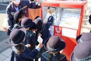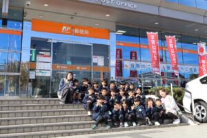 年中組のおともだちが、山形南郵便局に見学に行ってきました。最初に「おたよりがとどくまで」のビデオで、どのように郵便物が配達されるのかを教えていただきました。続いて事前におじいちゃんおばあちゃんやきょうだいに向けて書いたハガキを持ってきたおともだちがさっそく郵便ポストに投函! 郵便局の中では様々な機械で郵便物が仕分けられるところを見せていただき、郵便のお仕事に興味津々のおともだちでした。